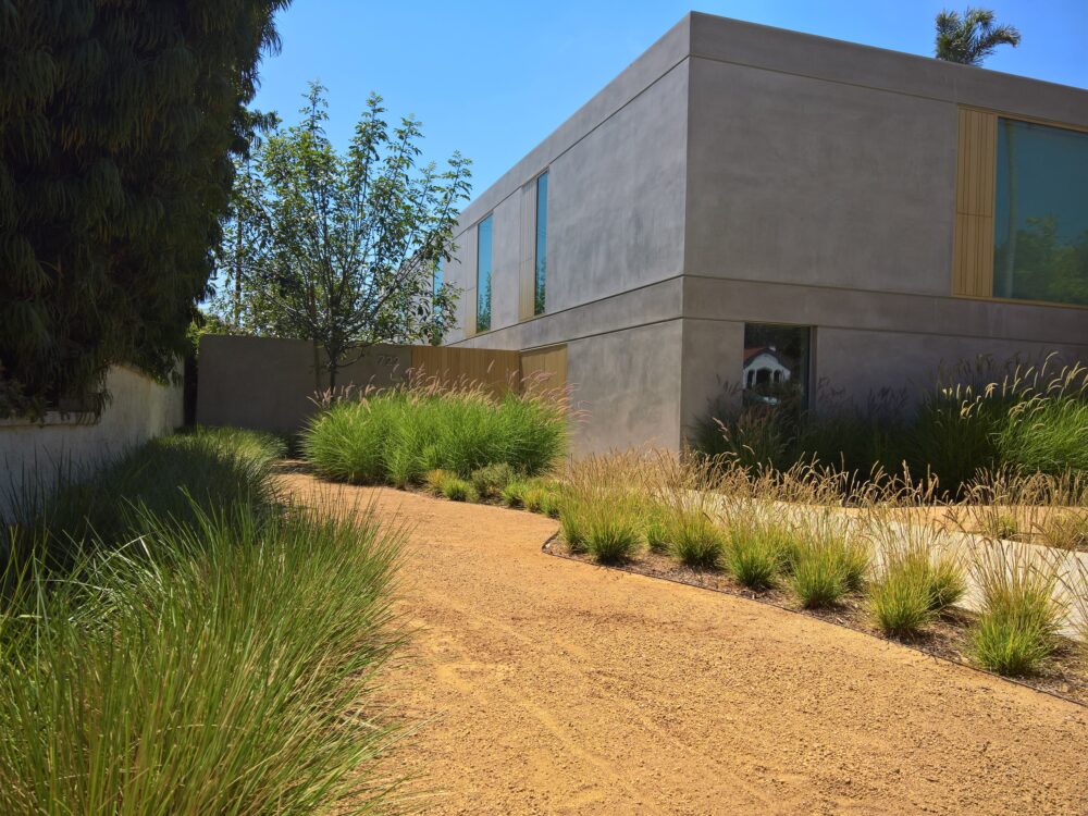 The streetside garden evokes a coastal meadow, with native grasses and California perennials planted in loose drifts. Decomposed granite paths thread between them, offering a porous transition from public to private. Inside the gated garden, a linear grove of plane trees accentuates the long side yard, drawing the eye toward a hidden staircase beneath the guest house.