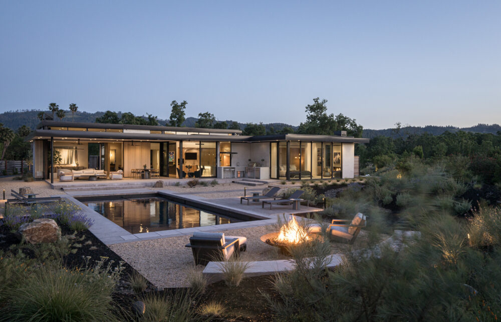 Two fountains offer sonic punctuation, while a generous enclosed lawn provides space for the clients’ dogs to roam. The pool, nestled into the vineyard-facing edge of the site, completes the composition with reflective calm.